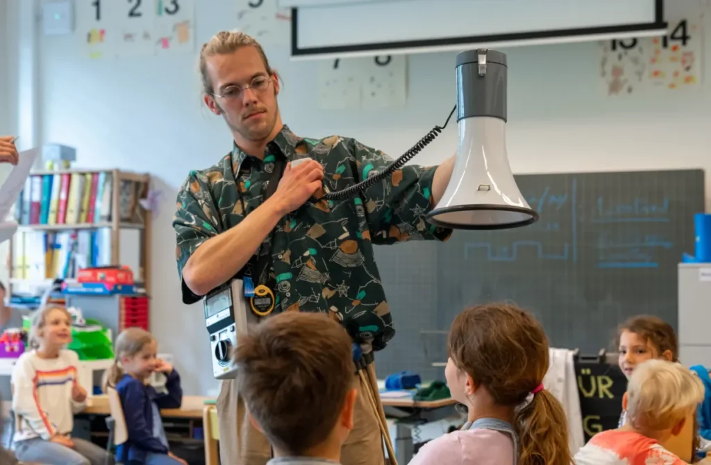 Two employees of an extraordinary agency enter the classroom. Without prior notice, they examine the room and everything in it for its acoustic phenomena and sonic properties—including the students and teachers! These sound researchers of everyday school life move chairs, test the blackboard and chalk for volume and rhythmic possibilities, and experiment with understanding quiet and fast speech.